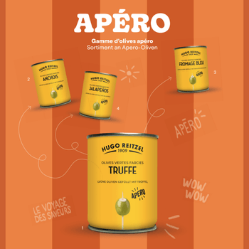 Nos olives apéro se déclinent en quatre saveurs irrésistibles : anchois, fromage bleu, truffe et jalapeños.