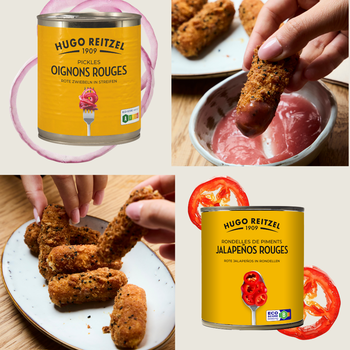 Au menu : les croquettes au Vacherin Fribourgeois, au maïs et l’ingrédient phare : nos pickles d’oignons rouges et nos jalapeños rouges pour plus de piquant !