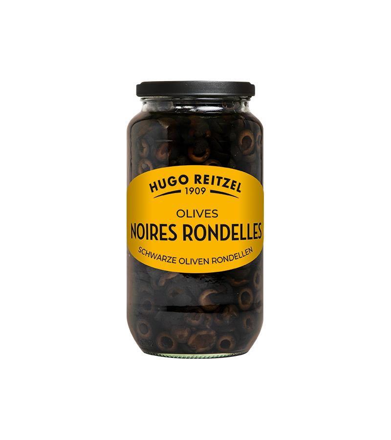 Olives noires en rondelles, eau, sel de cuisine, stabilisant : gluconate de fer. Peut contenir exeptionnellement un noyau non eliminé.