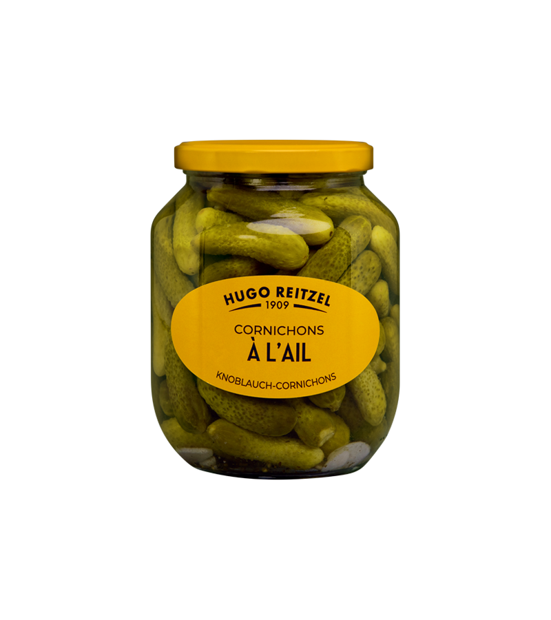Cornichons, vinaigres d'alcool et de vin blanc, sucre, sel de cuisine iodé, ail 1.2%, épices et extraits d'épices (avec graines de MOUTARDE), antioxydant (E224: SULFITE).
